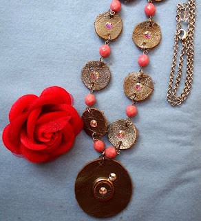 Colar em cristal tcheco, entremeios de resina e fio de couro
